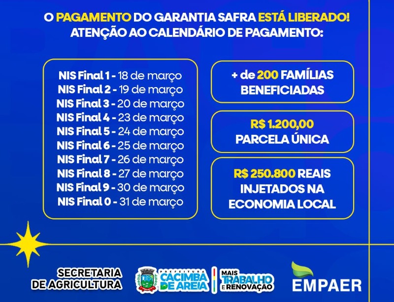 O pagamento do Garantia Safra 2024/2025 já está liberado para os pequenos agricultores de Cacimba de Areia-PB. O comunicado veio através da Secretaria Municipal de Agricultura, que por mais um ano, realizou os procedimentos, fez a convocação dos prováveis beneficiários, desenvolvendo as atividades de competência da prefeitura municipal, para que o benefício seja pago.