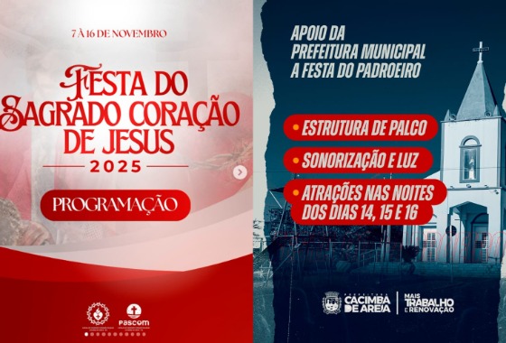 A Prefeitura de Cacimba de Areia-PB, confirmou no final da manhã desta quarta-feira (05), a parceria com a paróquia local da cidade, prestando apoio solicitado pelo responsável da paróquia do Sagrado Coração de Jesus o Mons. João Saturnino de Oliveira, administrador paroquial. A comunidade católica local, celebra a partir da próxima sexta-feira (07) até o dia 16 deste mês, o seu padroeiro Sagrado Coração de Jesus.